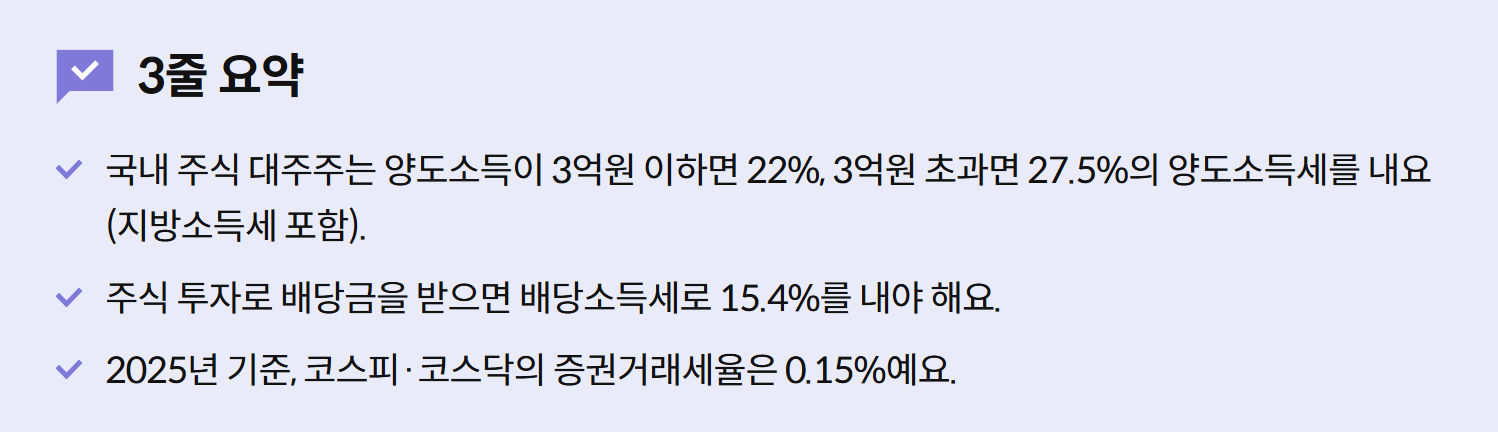 | 증권거래세 | 0.15% (2025년 코스피·코스닥 기준, 농어촌특별세 포함) |