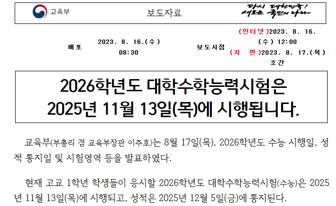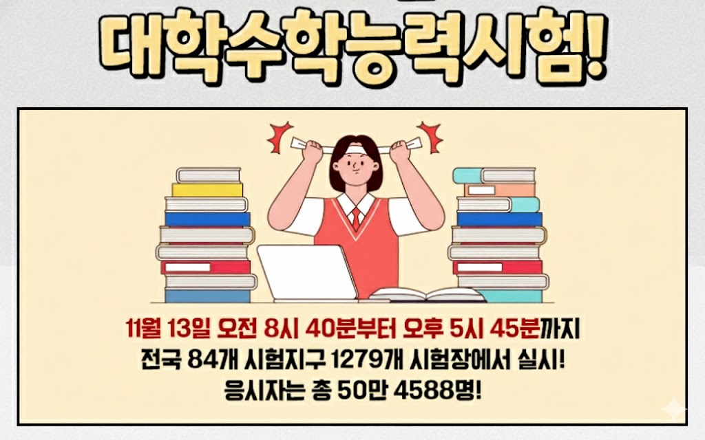 2026학년도 대학수학능력시험일이 하루 앞으로 다가왔습니다.항상 연말쯤 되면, 대한민국이 들썩거리는 한가지 대형 이벤트가 있지요?대부분의 여러분도 한번쯤 거치게 되는 과정 중에 하나라