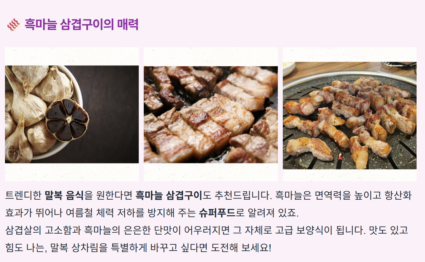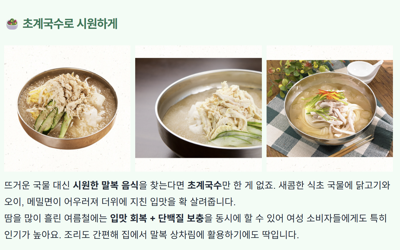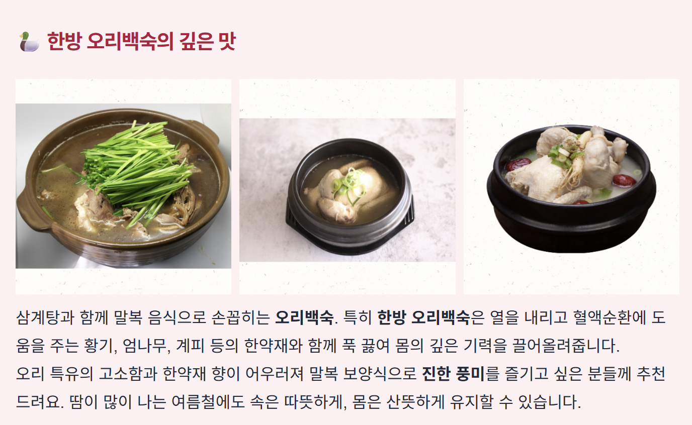 | 삼계탕 | 기력 회복, 면역 강화 | 복날 대표 음식 |