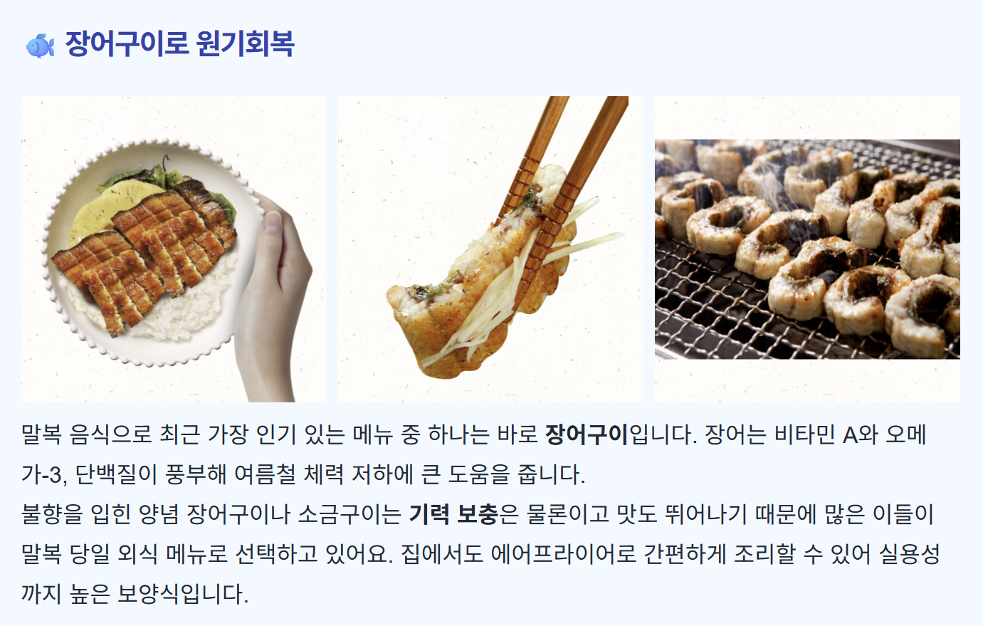 | 장어구이 | 피로 해소, 스태미나 강화 | 맛과 영양 균형 |