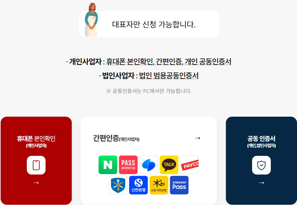 - 본인 인증 – 개인: 간편인증, 법인: 범용 공동인증서 필요