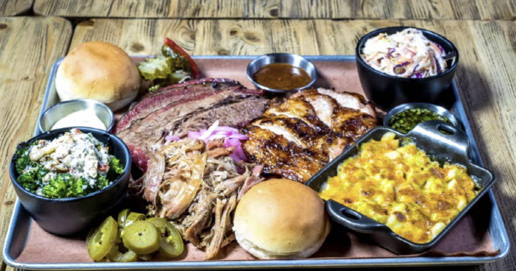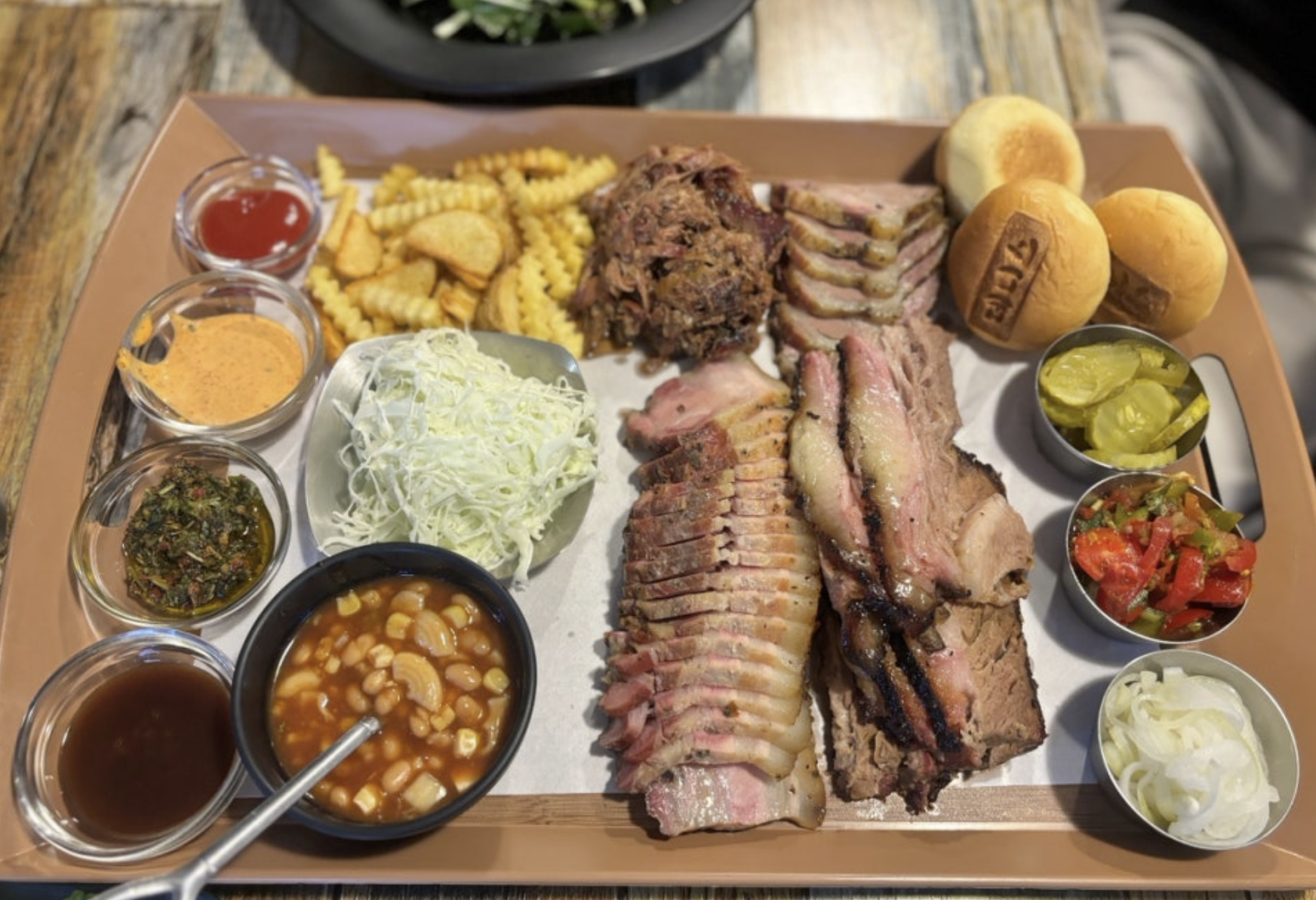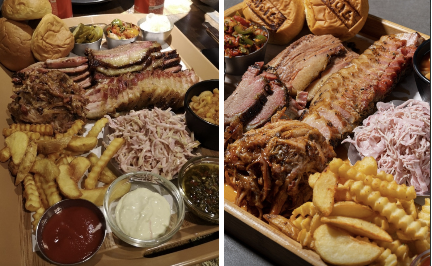 사진을 보면 고기들이 진한 색감과 바크 층을 가진 모습이 인상적이며, 고기 외에도 빵(모닝빵), 샐러드, 피클 등 곁들임 구성도 충실한 모습