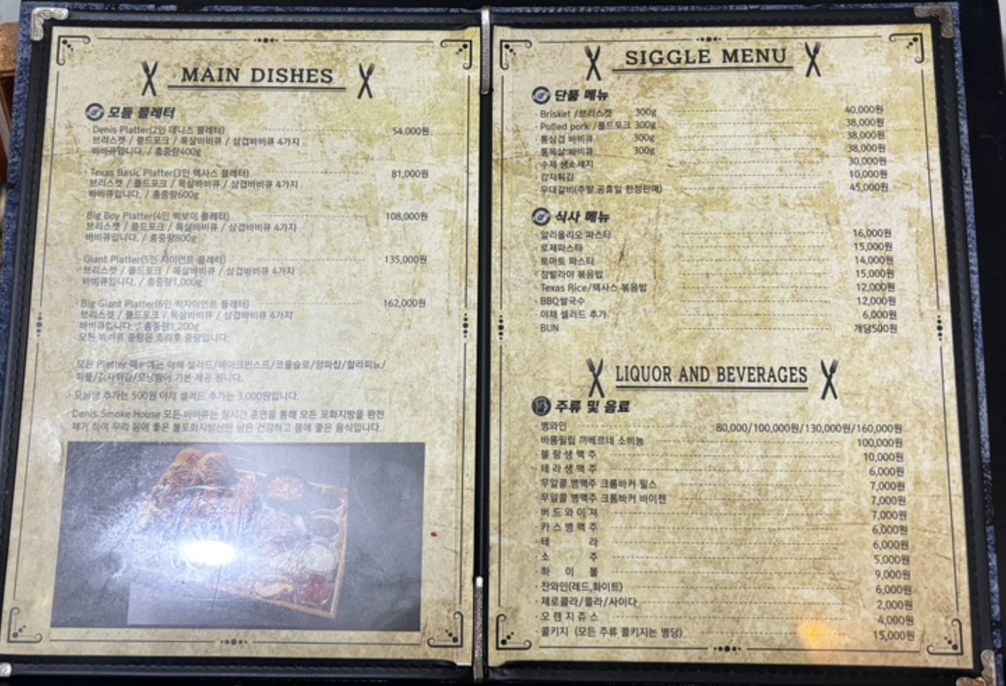 | 바비큐 플레터 / 데니스 플래터 | 여러 종류의 바비큐를 한 번에 맛볼 수 있는 구성 (브라스켓, 포크, 목살, 삼겹 등). 2인 기준 46,000원 선의 가성비 후기 있음. |