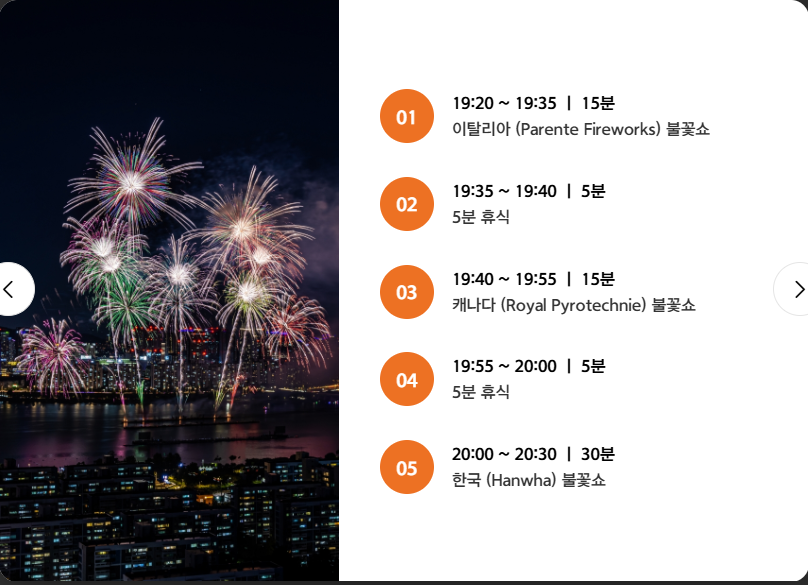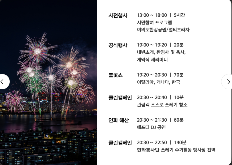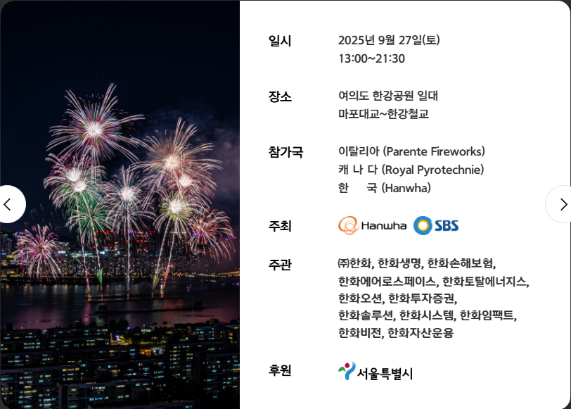 주최 측인 한화가 소개한 명당은 ‘이촌 한강공원’이다. 여의도보다 인파가 적고, 한강 경치와 불꽃 쇼를 한눈에 감상할 수 있다. 또 4호선 이촌역에서 가까워 대중교통을 이용하기에도 편하다.