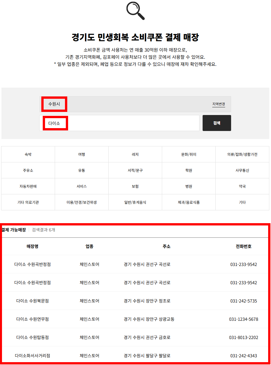 이번에는 수원시로 검색해서 다이소 검색해보니 총 6곳이 나오네요.