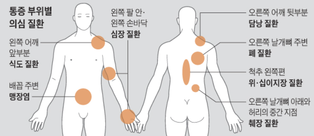 - 가슴통증이 왼팔, 어깨, 목 또는 턱으로 퍼지는 경우가 많습니다.