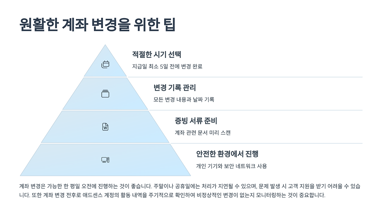 이 팁들만 기억해두면 애드센스 계좌 변경도 걱정 없답니다. ✨