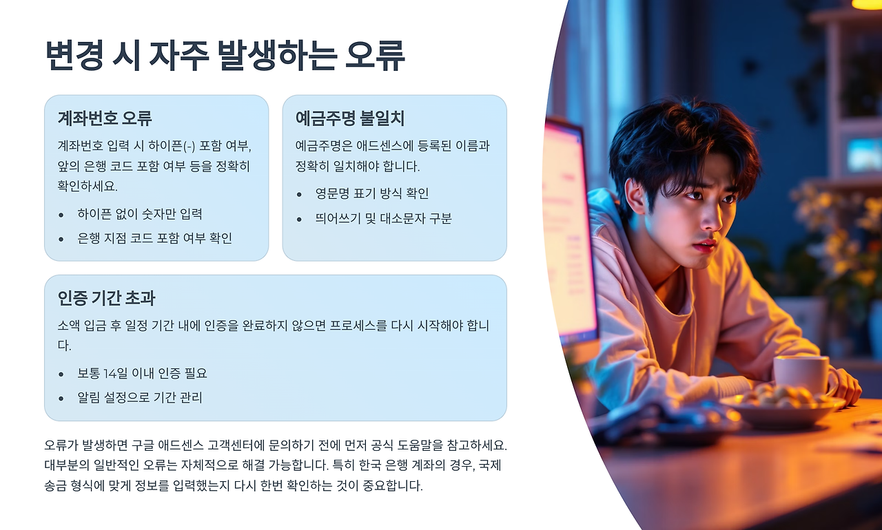 애드센스 수익계좌 변경 시 몇 가지 흔한 오류들이 발생할 수 있어요. 미리 알아두면 당황하지 않고 빠르게 해결할 수 있답니다. 여기서 주요 오류와 해결 방법을 함께 살펴볼게요. 🛠️