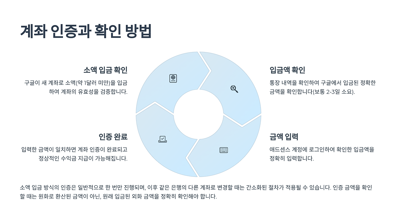 구글은 신규 계좌 등록 시 소액 입금 인증 절차를 요구할 수 있어요. 인증 방법을 미리 알아두면 빠르게 계좌가 활성화된답니다.