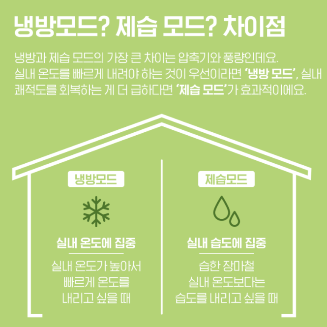 - 현명한 선택: 습도가 높은 날에는 냉방 모드를, 습도가 비교적 낮고 쾌적함을 유지하고 싶을 때는 제습 모드를 활용하는 것이 좋습니다.