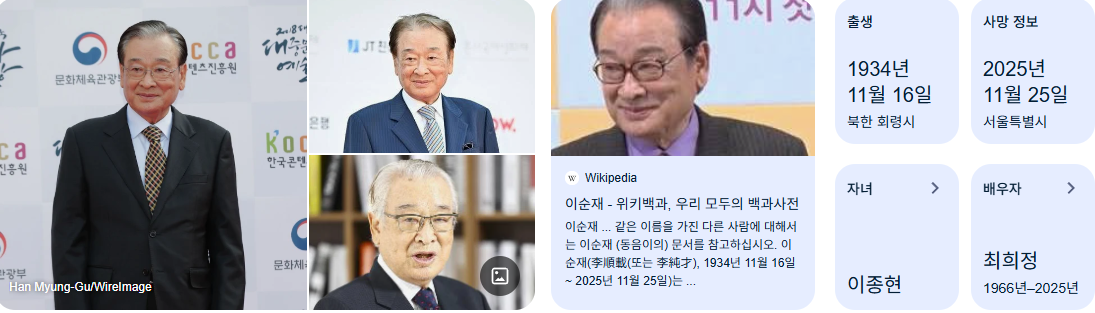 - 대표 출연작: 드라마 '사랑이 뭐길래', '목욕탕집 남자들', '허준', 시트콤 '거침없이 하이킥' 등 다수의 작품에서 인상적인 연기를 선보였습니다. 특히 '꽃보다 할배' 예능 프로그램에서는 '직진 순재'라는 별명으로 젊은 세대에게도 큰 인기를 얻었습니다.