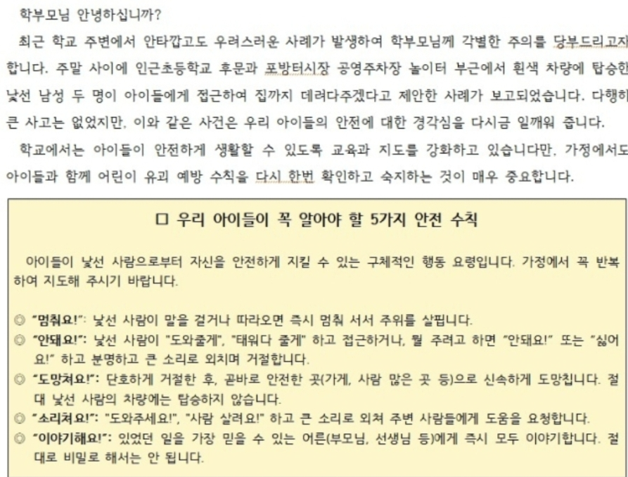 3. **주변 감시** : 아이들이 다니는 길이나 학교 주변의 안전을 점검하고, 이상한 행동을 하는 사람을 발견하면 즉시 신고하도록 합니다.