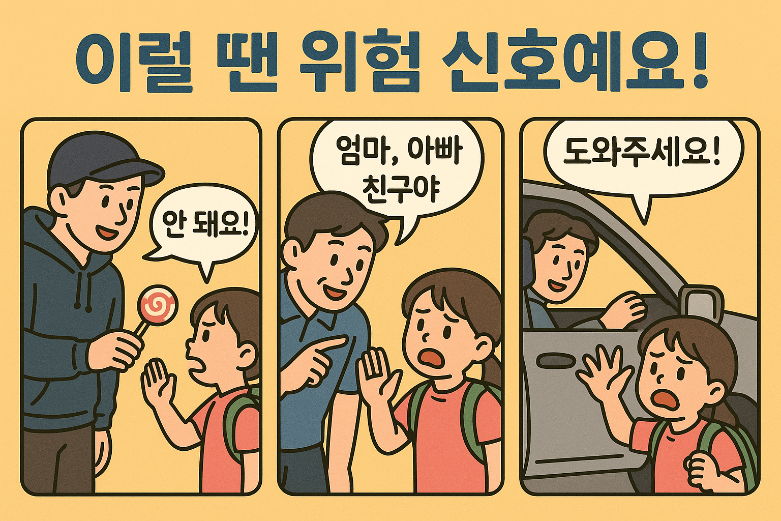 1. **아이와의 대화** : 아이들에게 낯선 사람과의 접촉을 피하도록 교육하고, 위험한 상황에서 어떻게 대처해야 하는지 알려줍니다.