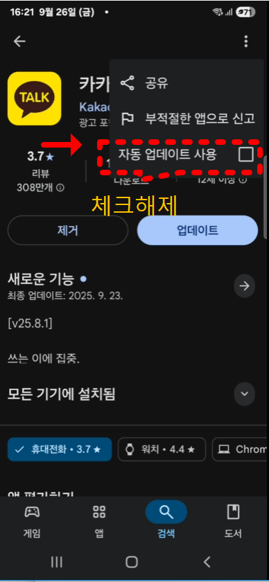 안드로이드 (갤럭시 등) - 카카오톡 자동업데이트 해제 방법