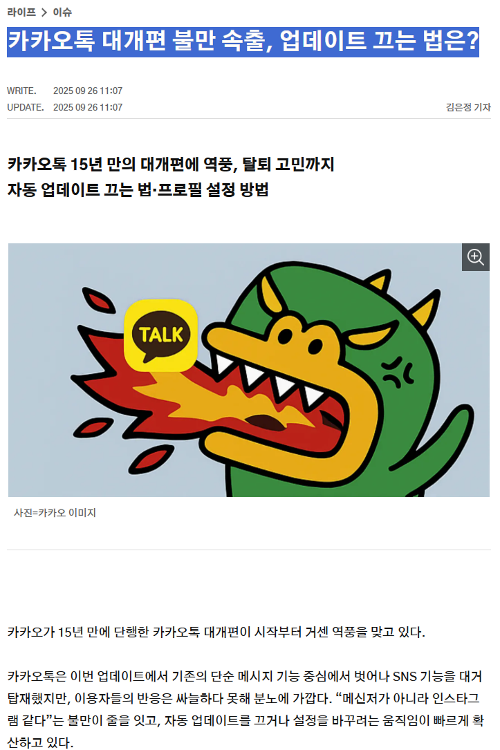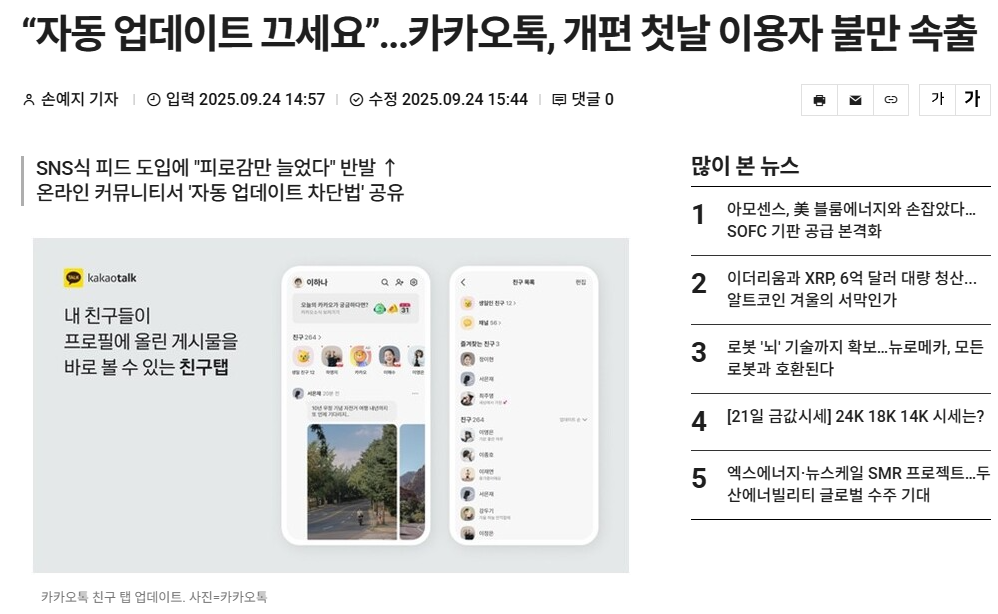 어제 오늘 갑작스런 카카오톡 업데이트 후 불만글이 속출 하고 있습니다.