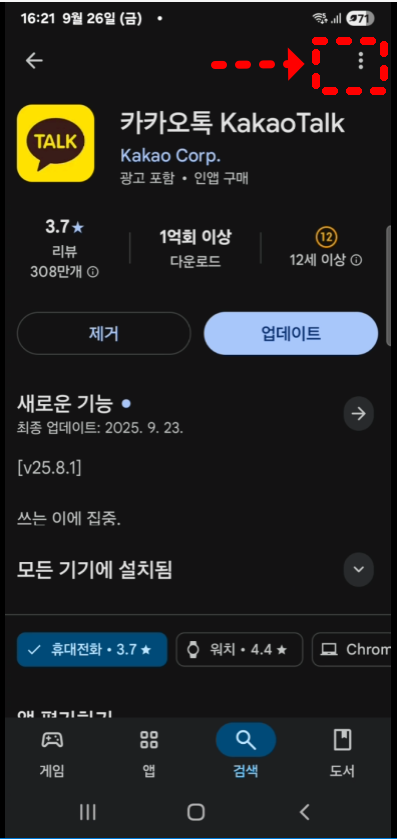 - 안드로이드: Play 스토어 > 내 앱 > 업데이트 가능 앱 확인 > 카카오톡 수동 업데이트