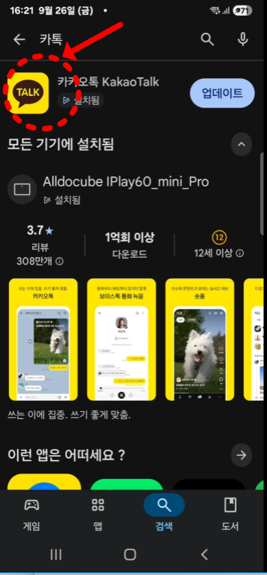 - 상단 검색창에 카카오톡을 입력하고 앱 상세페이지로 들어갑니다.