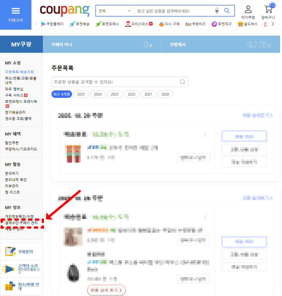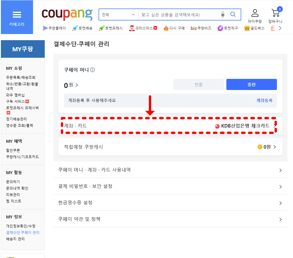 - 쿠팡 앱 실행 → 마이쿠팡 → 전체 메뉴 → 결제 수단