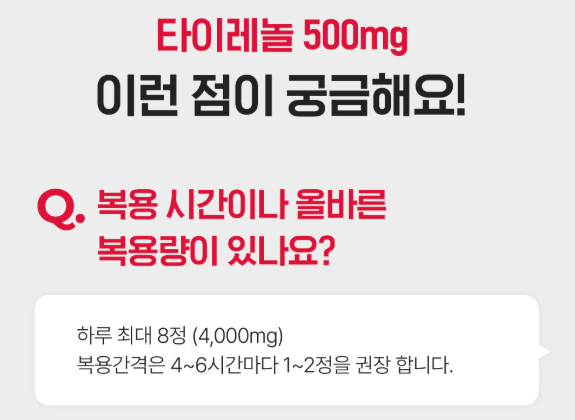 | 하루 최대 용량 | 4000mg | 절대 초과 금지 (하루최대 8정) |