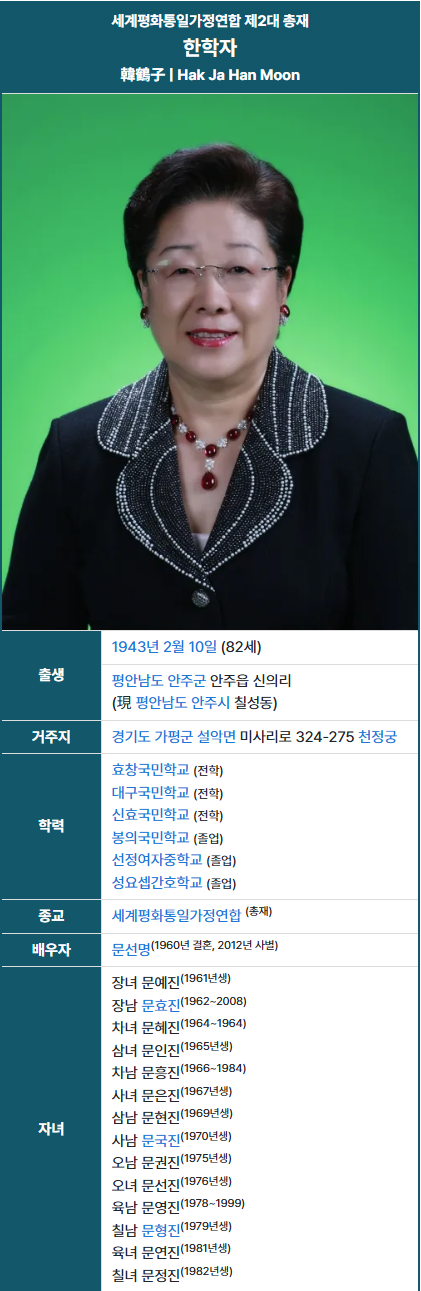 | 가족 관계 | 고 문선명 (남편), 자녀 13명 | 대표적 종교 명문가 |