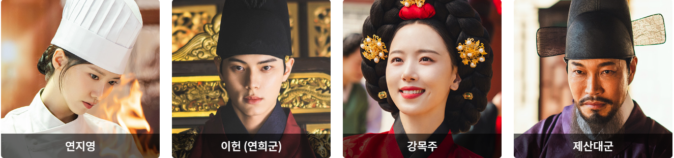 | 임윤아 | 연지영 | 프랑스 미슐랭 셰프로 활동하던 중 조선 시대로 타임슬립. 생존을 위해 요리를 무기로 삼는 주인공. |