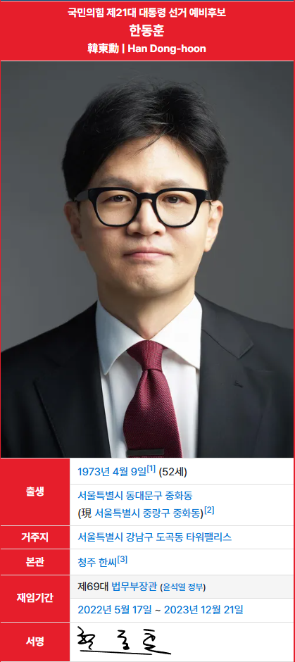 한동훈은 대한민국의 검사 출신 정치인으로, 윤석열 정부에서 법무부 장관을 역임했으며,