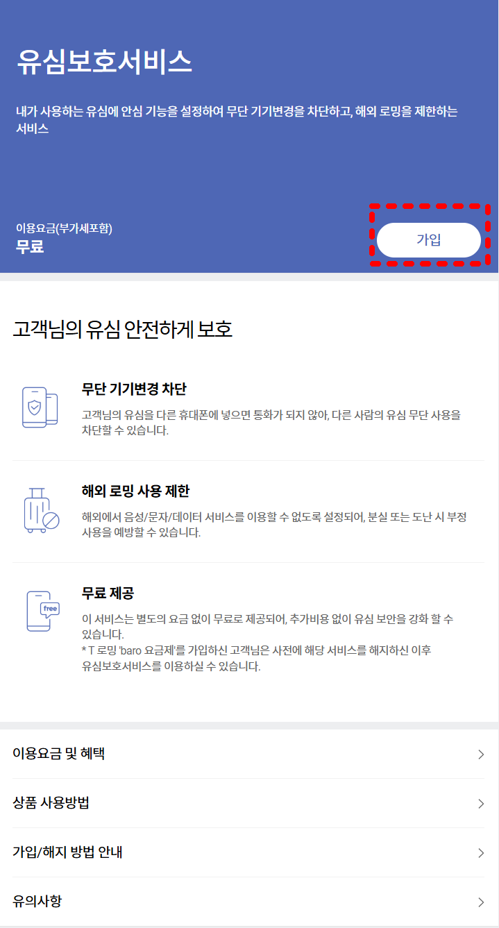 - 로밍 서비스와의 호환성: 유심보호서비스에 가입하면 해외 로밍 서비스를 이용할 수 없습니다. 로밍 서비스를 이용하려면 유심보호서비스를 해지해야 합니다.